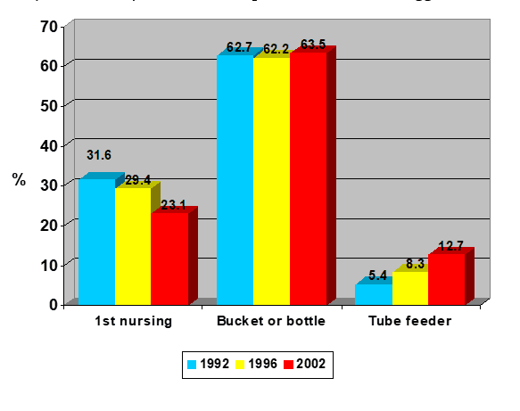 NAHMS researchers evaluated several aspects of colostrum management and compared the data in Dairy 2002 with information from previous surveys. These are summarized below. The overall picture suggests that we’re getting better at managing heifer calves. It’s important to note that the producers were asked about their management of heifer calves, not bull calves. This is important… especially if you are involved in raising bull calves commercially. It’s generally accepted that bull calves are not as well managed as heifers because their value is generally less. So, as you look at the survey, keep in mind that the questions are related only to heifers.