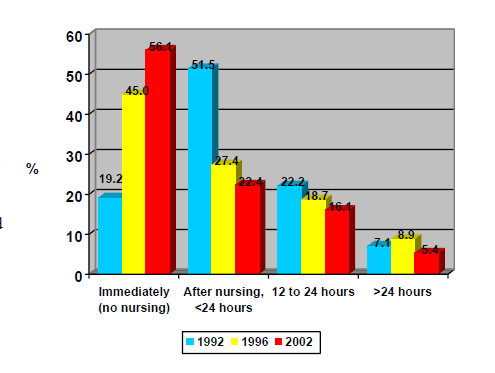 The first question related to the time at which calves were removed from the dam. Generally the information is quite positive (Figure 1). These numbers indicate that a greater percent of calves are removed from the mother prior to nursing and before the calf has a chance to pick up pathogens (bacteria and viruses) from the mother and calving environment. Several studies have shown that a major source of infection is the calving environment. The percent of calves that are left with the dam for more than 24 hours is going down and is just a little more than about 5% today. Overall, this should be helping reduce the risk of disease transmission in heifer calves.