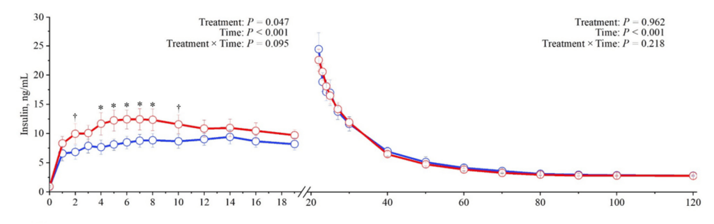 Effects of additional liquid feeding on glucose metabolism, there were differences in the way calves responded to a glucose infusion, as indicated in the Figure below. Calves fed 4 L of CMR (red line) produced more insulin in response to the glucose infusion during the initial phase. The authors proposed that preweaning milk supply may slightly affect glucose metabolism well after weaning. The biological and productive significance of this observation is unclear.