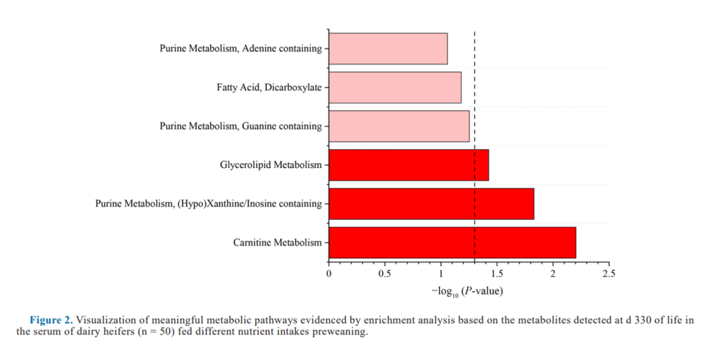 Changes in blood metabolites in calves when sampled well after weaning may indicate a long-term shift in metabolism. The authors reported that 14 metabolites were different between the two groups of calves. The metabolites were grouped by metabolic pathway – differences were related to carnitine, glycerolipid, and purine metabolism. When taken together, these data suggest subtle differences in nitrogen and fatty acid metabolism. However, these small changes were not associated with productive changes in growth or reproductive performance.
