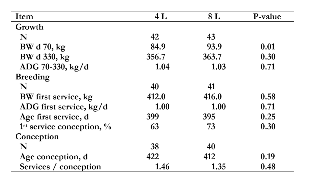 At 70 d of age, calves fed 8 L of CMR were heavier (9 kg), but by 330 d, the difference was no longer significant. Breeding and conception statistics indicated that there was no effect of treatment on reproductive performance or growth from 70 to 330 d of age. The lack of differences were attributed to the quality of the post-weaning diet. The authors hypothesized that the postweaning growth rate (>1 kg/d from 70 to 330 d) allowed both groups to grow rapidly and the reproductive tract of calves fed 4 L of CMR to “catch up”.
