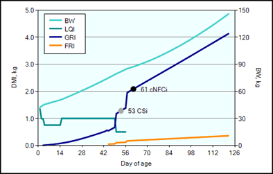 The graph above shows the age at which the calf is ready to be weaned, which is 61 days of age.