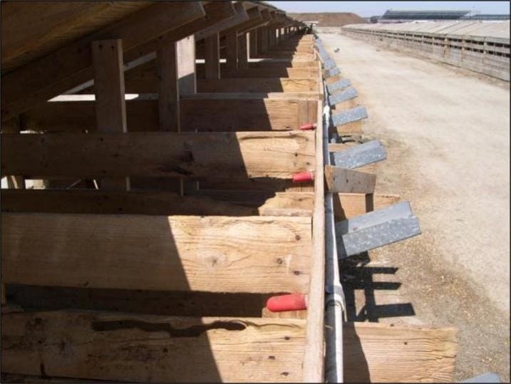 The solution was both simple and ingenious. Each hutch pen was fitted with a piglet-style nipple waterer inserted through the wooden wall of the hutch. The waterers were connected to PVC pipe that ran along the length of each row. To encourage proper drinking behavior, a calf nipple was placed over the piglet nipple and secured with a zip tie. Each row of hutches had its own shutoff valve, allowing staff to manage water flow as needed.
