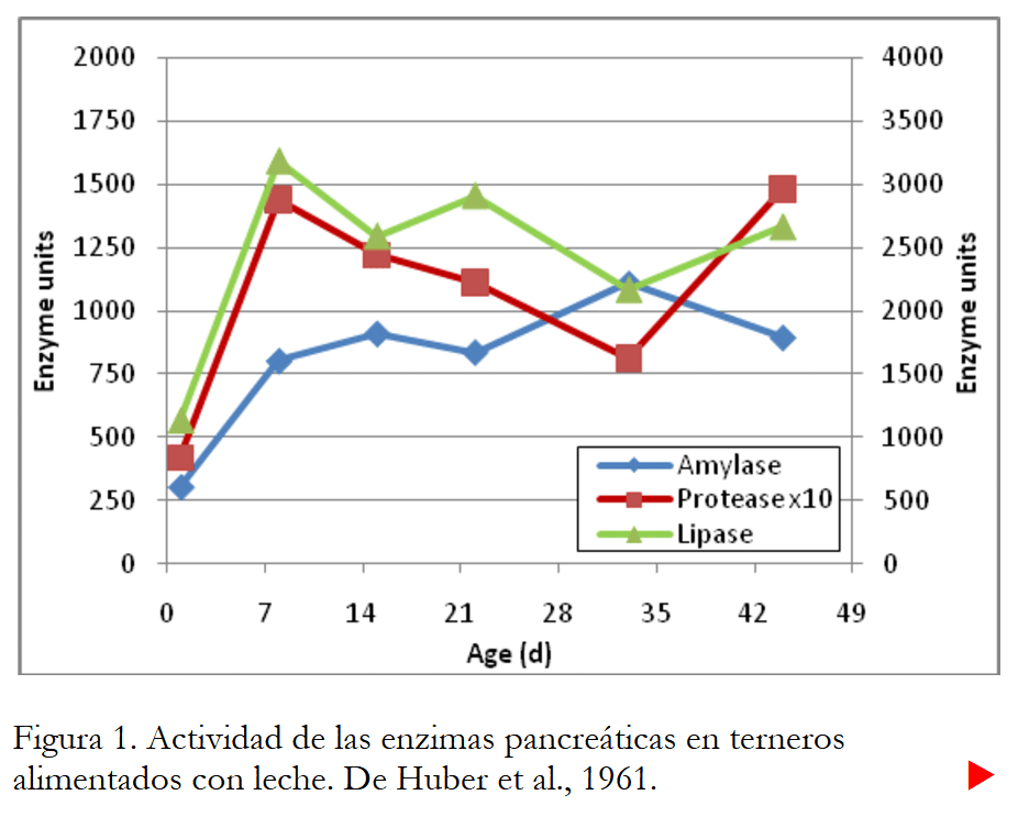 Digestión y metabolismo. Las enzimas y secreciones gastrointestinales que utilizan los terneros para digerir su alimento no se activan “mágicamente” a las 24 horas de edad. Muchos o la mayoría de ellos aumentan gradualmente con el tiempo. Por ejemplo, Huber et al. (1961) midieron la actividad enzimática en terneros alimentados con leche de 1 a 44 días de edad. La actividad media de las enzimas en el páncreas se muestra en la Figura 1. Como puede ver, la actividad de todas las enzimas (lipasa, proteasa y amilasa) fue menor el día 1 que otros días y luego aumentó el día 8. A partir de entonces, las actividades no cambiar dramáticamente. Otros investigadores han informado datos similares (Ternouth y Buttle, 1973; Ternouth et al., 1976; Sissons, 1981). Generalmente, las actividades de muchas (pero no de todas) las enzimas tienden a aumentar con el tiempo. Sin embargo, esto a menudo depende del tipo de dieta, la cantidad de alimento sólido consumido (y el posterior desarrollo del rumen) y la edad. Pero los datos parecen claros: la mayoría de las enzimas son menos activas en los primeros días de vida. Por lo tanto, no debemos asumir que los terneros están listos para digerir el mismo tipo de dieta el día dos que el día 20.