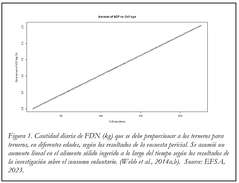 Se recomienda que de las 2 a 8 semanas de edad los terneros reciban un total de 11 kg de FDN, entre las semanas 9 y 18 un total de 65 kg de FDN, y entre las semanas 18 y 25 un total de 90 kg de FDN. alcanzando un total de 166 kg por ciclo de cría.
