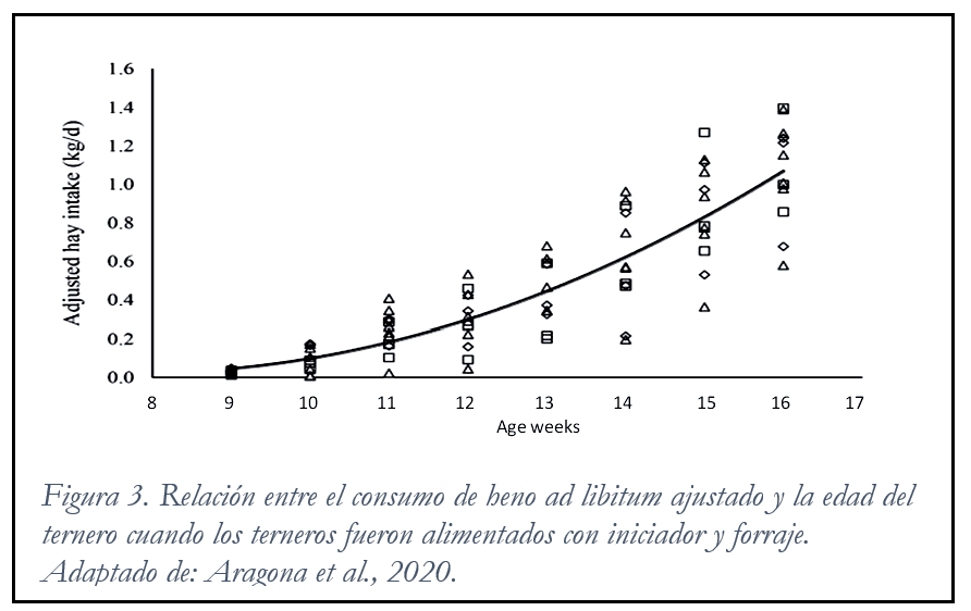 Xiao y col. (2023) evaluaron los efectos de la edad al ofrecer forraje a terneros con el consumo y el crecimiento. A los terneros (n = 84) se les ofreció heno a los 5, 8 o 12 días de edad. A un cuarto grupo de control solo se le ofreció concentrado. Todos los terneros fueron alimentados con tratamientos hasta los 84 días de edad. Se alimentó con leche entera a razón de 8 a 10 L/día hasta el destete a los 57 días de edad. Sus resultados mostraron que ofrecer heno temprano reducía la ganancia de peso corporal y la digestión de nutrientes. Los autores concluyeron: “En general, comenzar a consumir forraje voluntariamente a una edad más temprana tendía a afectar negativamente el crecimiento del ternero a corto y largo plazo. Estos terneros podrían haber tenido una capacidad limitada para digerir el alimento sólido y utilizar los nutrientes digeribles en comparación con los terneros que comenzaron más tarde o consumieron solo alimento iniciador. Sin embargo, se encontraron tiempos de rumia y fermentación ruminal similares entre los grupos, lo que sugiere que las diferencias en el crecimiento no estaban relacionadas con el desarrollo del comportamiento de rumia.”