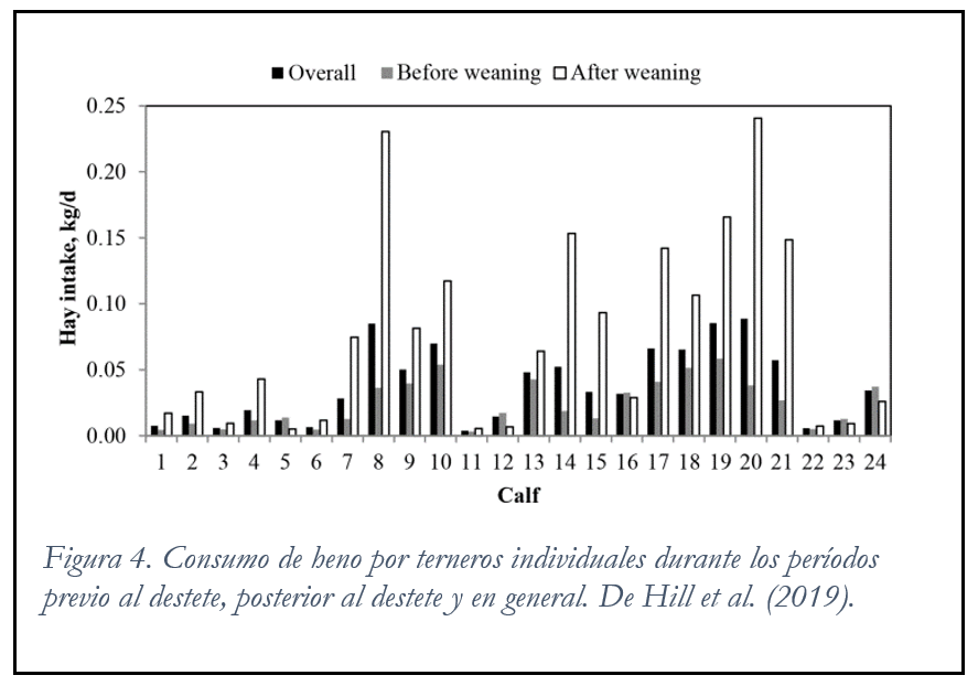 Cuando a los terneros se les ofrece forraje para consumo ad libitum junto con concentrados, el consumo de forraje es muy variable, como se muestra en la Figura 3 de Hill et al. (2019). Estos terneros fueron alimentados con sustituto de leche, iniciador ad libitum y forraje ad libitum. Está claro que muchos terneros consumieron poco o ningún forraje largo durante los 56 días del experimento. En general, los terneros consumieron el 6% de su materia seca total como forraje. Esto es similar a los datos de Castells et al. (2012), quienes informaron que los terneros a los que se les ofrecía heno de avena, paja de cebada o heno de raigrás ad libitum consumían el 8%, el 5% y el 4% del consumo total de alimento seco como forraje, respectivamente. Finalmente, cuando calculamos el consumo voluntario de forraje a partir de los datos de Xiao et al. (2023), el % del consumo total de alimento seco como forraje fue del 10%, 11% y 11% para los terneros a los que se les ofreció forraje a partir del día 5, 8 o 12, respectivamente. Todos estos datos sugieren que cuando los terneros pueden elegir, consumen una dieta principalmente de concentrado y no de forraje. Las cantidades recomendadas por la EFSA superan con creces lo que parecen preferir los terneros.