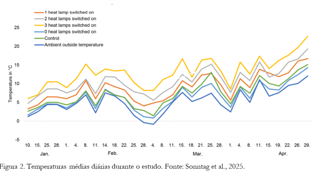 O estudo foi realizado em fazenda leiteira no nordeste da Alemanha, de janeiro a abril de 2022. As temperaturas ambientes variaram de -7,3 a 21,8°C, com média de 5,4°C.