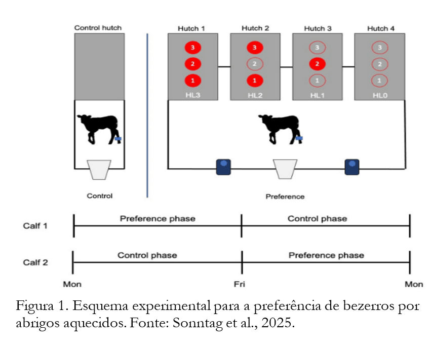 Bezerros Holandês–Frísio (n = 32) nasceram em fazenda leiteira na Alemanha e foram separados imediatamente da mãe. Os bezerros receberam 4 L de colostro e foram alojados em abrigos individuais durante os períodos de controle. Durante o período de teste de preferência, os bezerros foram transferidos para uma área separada que continha quatro diferentes abrigos, cada um com 0, 1, 2 ou 3 lâmpadas de aquecimento (250 W, posicionadas a 1 m do chão) acesas. A Figura 1 mostra o esquema geral de alojamento utilizado no experimento. Os bezerros eram mantidos no abrigo de controle (monitorados por 3 a 4 dias) e, em seguida, transferidos para a área de preferência para avaliação comportamental (3 a 4 dias). Os pesquisadores utilizaram acelerômetros e câmeras de vídeo para determinar a localização e a postura dos bezerros. O estudo foi realizado durante a primeira semana de vida.