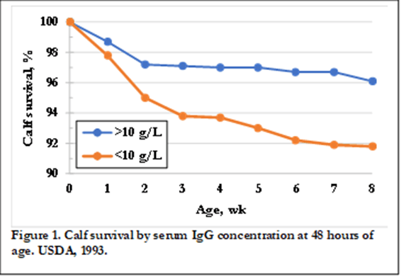 1993年,美国农业部国家动物健康监测系统(USDA NAHMS)公布了首个全国奶牛后备母牛评估项目的结果。该项目涵盖28个州的1,811个牧场,代表了美国78%的奶牛群体。NAHMS研究报告显示,41%的犊牛发生FPT(USDA, 1993)。此外,与成功获得被动免疫的犊牛相比,发生FPT的犊牛存活率明显较低(图1)。这些数据对行业产生了深远影响,大学推广部门、兽医、营养学家以及其他乳业专家纷纷努力改善牧场初乳管理和犊牛存活率。随后NAHMS的研究记录了这些努力在降低FPT发生率和提高存活率方面的成果。最新一次NAHMS研究于2014年进行(USDA 2016, 2018),结果显示仅有13%的后备母犊发生FPT,近73%的后备母犊血清IgG浓度超过15 g/L(Urie 等, 2018a)。需要注意的是,不同NAHMS研究之间的比较较为复杂,因为所测量的动物群体不同(更多信息见犊牛笔记143)。